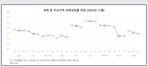 KIEP, 내년 세계 성장률 3.0%로 조정…"美 관세정책 충격 예상보다 적어" 국책연구기관인 대외경제정책연구원(KIEP)이 내년 세계 성장률을 3.0%로 예상했다. 미국 관세정책 등의 충격이 당초 우려보다 제한적이고 주요국의 내수와 수출이 견조하다는 판단에 직전 전망보다 0.1%포인트 상향조정했다. 내년 키워드 '완충된 둔화, 비대칭의 시대'…"기술 투자 쏠림 현상 우려" KIEP는 11일 '2026년 세계경제전망'을 통해 내년 세계 경제성장률을 3.0%로 예측했다. 이는 경제협력개발기구(OECD) 예측치(2.9%)보다 0.1%포인트 높고 2025-11-11 16:00:00 -