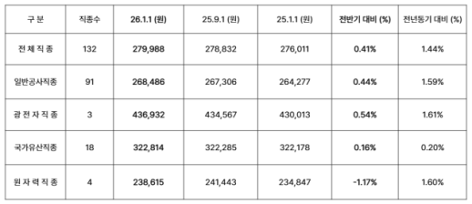 올 상반기 건설업 하루 평균 임금 28만원...지난해보다 1.44%↑ 올해 상반기 건설업 하루 평균 임금이 지난해 같은 기간보다 약 1.4% 오른다. 대한건설협회는 1일 이같은 내용을 담은 '2026년 상반기 적용 건설업 임금 실태조사'를 발표했다. 협회에 따르면 전체 132개 직종의 하루 평균 임금은 27만9988원으로, 지난해 하반기 대비 0.41%, 작년 상반기 대비 1.44% 상승했다. 직종 수가 가장 많은 일반공사직종(91개) 평균 임금은 26만8486원으로 작년 하반기보다 0.44%, 지난해 상반기 대비 1.59% 올랐다. 평균 임금이 가장 높은 광전자직종(3개)은 작년 하 2026-01-01 14:01:03 -